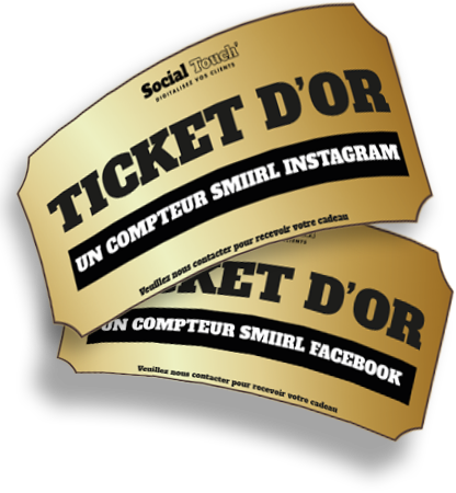 Pendant tout le mois de Mai, SocialTouch’ s’associe à Smiirl pour offrir à ses clients une chance unique de suivre leur impact sur les réseaux sociaux en temps réel. Pour toute commande passée sans minimum requis, deux clients chanceux recevront un ticket d’or indiquant qu’ils ont gagné un compteur Smiirl pour leur page Facebook ou leur compte Instagram. Cette offre est disponible uniquement en France métropolitaine.